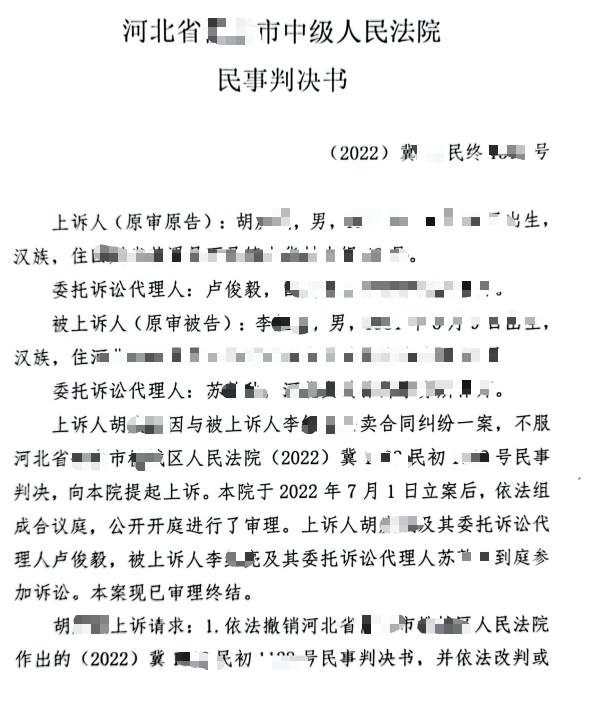 胡xx要求解除合同并赔偿损失,一审法院驳回其诉请后,于是委托卢俊毅律师代理其提起上诉。